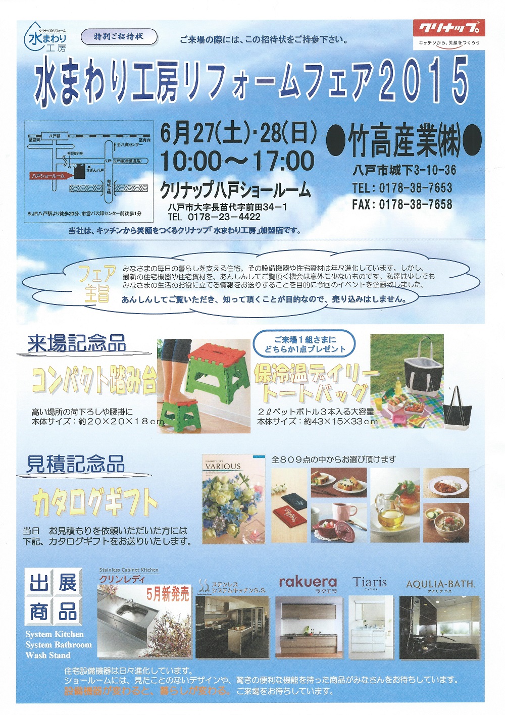 2015年6月27日(土)28日(日)、八戸市・クリナップ八戸ショールームにて、当社を含む7社合同イベント『水まわり工房リフォームフェア2015』が開催されました。